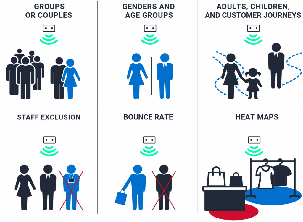 Our sensors measure entrances and exits in real time and, thanks to AI, provide additional insights about visitors or customers: gender, age group, distinction between staff and visitors, and much more, all without any image storage or transmission.